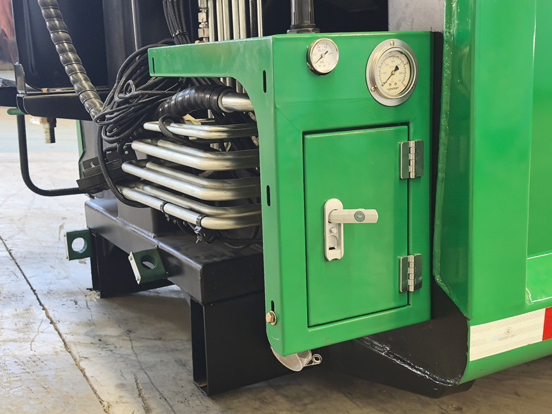 ●La parte superior del camión compactador de residuos utiliza un sistema hidráulico para accionar la cargadora. Una vez que la basura se carga en la boca de carga, la pala empujadora, accionada por un cilindro hidráulico, la introduce en la cámara de compresión.