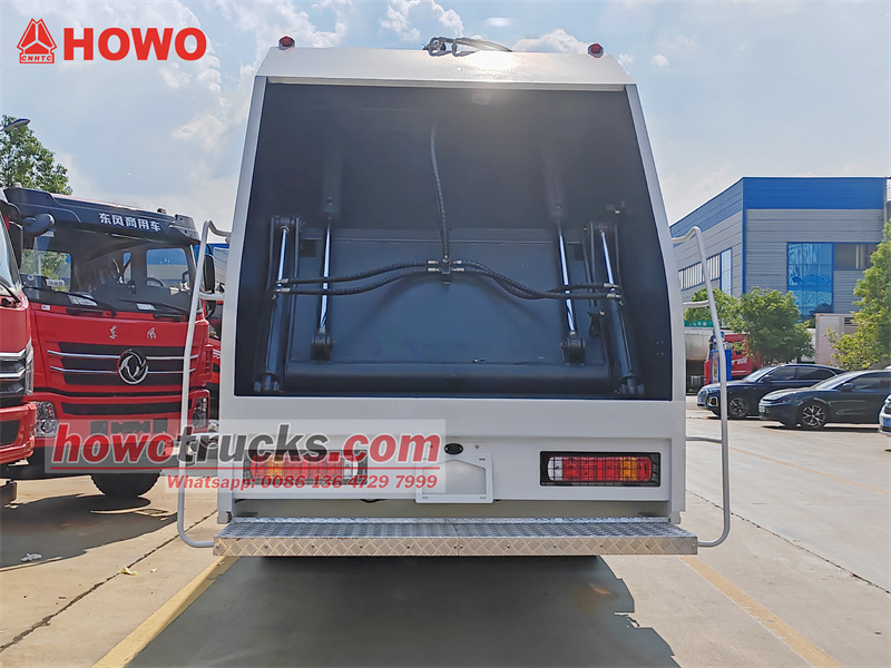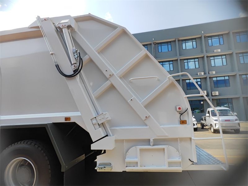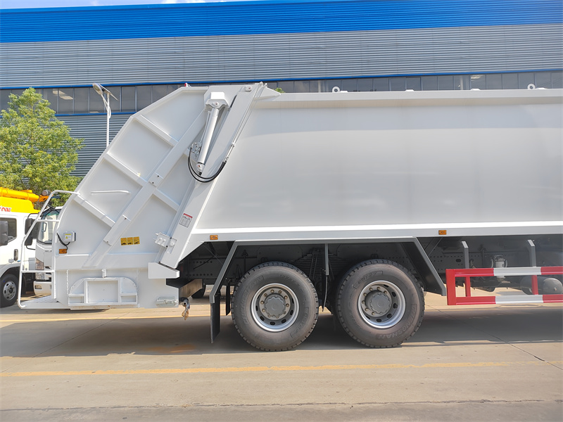 El camión de basura HOWO 6x4 de 22 m³ con cargador trasero está modificado a partir del chasis Sinotruk HW76 6x4, con una distancia entre ejes de 4600 + 1350 mm, un motor Weichai WP10.340E22 y una caja de cambios Sinotruk HW19710 de 10 velocidades. La carrocería superior es una caja compactadora de basura de acero al carbono de 22 m³ con forma de arco y tratamiento anticorrosión y antióxido. No tiene mecanismo de volteo en la parte trasera, pero sí una pequeña plataforma para que los operarios se suban a descargar la basura. Dispone de pasamanos a ambos lados de la caja de carga y pedales plegables en el lateral. La carga y descarga de basura en este vehículo se controla mediante el sistema de control electrónico CAN-BUS, específicamente mediante la caja de control electrónico en la cabina, la palanca de operación hidráulica manual en el lado del conductor y la caja de control electrónico del portón trasero.