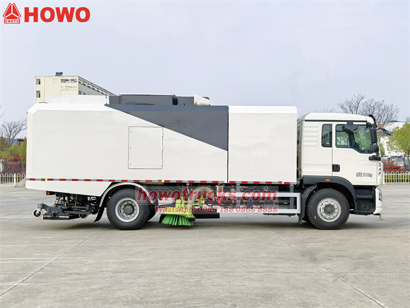 The Howo 12cbm hydro jetter road sweeping truck is a professional road sweeping equipment positioned in the medium-to-heavy-duty market. Built on the Howo TX chassis, it features a 4600mm wheelbase and a gross vehicle weight of 18,000kg. Its design balances flexibility and operational stability, allowing it to move easily through various scenarios such as city streets and industrial parks without space constraints. The vehicle offers optional left/right-hand drive to suit different regional needs. The cab is equipped with air conditioning, and the manual tilt design combined with mechanical suspension significantly improves driver comfort, making it suitable for long-term cleaning operations.