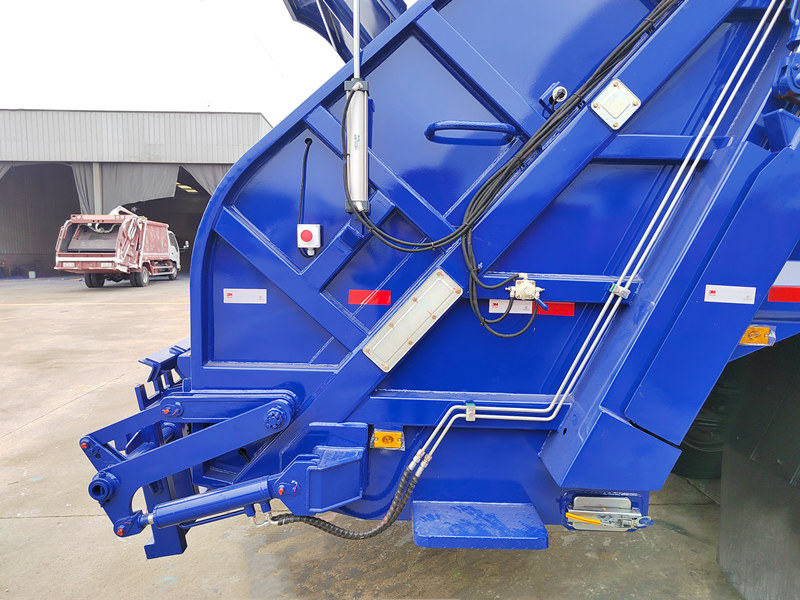 ♦Cuando el vehículo llega a la planta de tratamiento de residuos, el sistema hidráulico invierte su funcionamiento, empujando el empujador para expulsar los residuos comprimidos de la caja del camión.