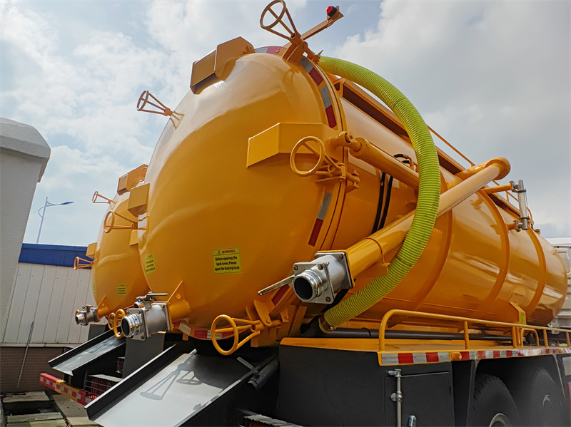 El camión de succión de aguas residuales HOWO 6x4 de 20 m³ está modificado sobre el chasis HOWO TX430, con una distancia entre ejes de 4600+1350 mm, equipado con un motor Weichai WP12S430E201 y una caja de cambios Sinotruk HW19710. La parte superior es un tanque de aguas residuales de 20 metros cúbicos fabricado en acero al carbono con un espesor de 5 mm. El vehículo está equipado con una bomba de vacío de circulación de agua 2BEA-204 con una capacidad de 20 m³.³/min, un visor, un filtro secundario, una válvula de descarga, una tubería de aguas residuales, una escalera, una caja de herramientas, un manómetro de vacío, una válvula de control del lado izquierdo, una válvula de control para abrir y cerrar la puerta trasera y un elevador de tanque.