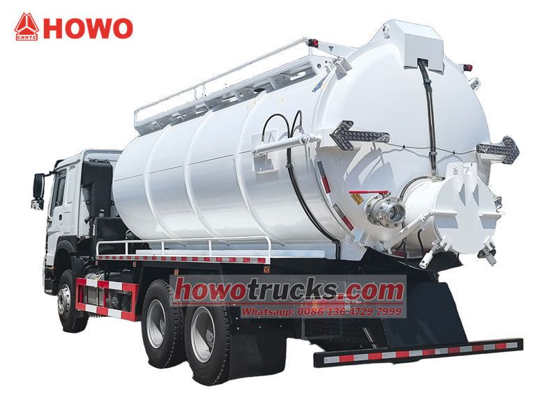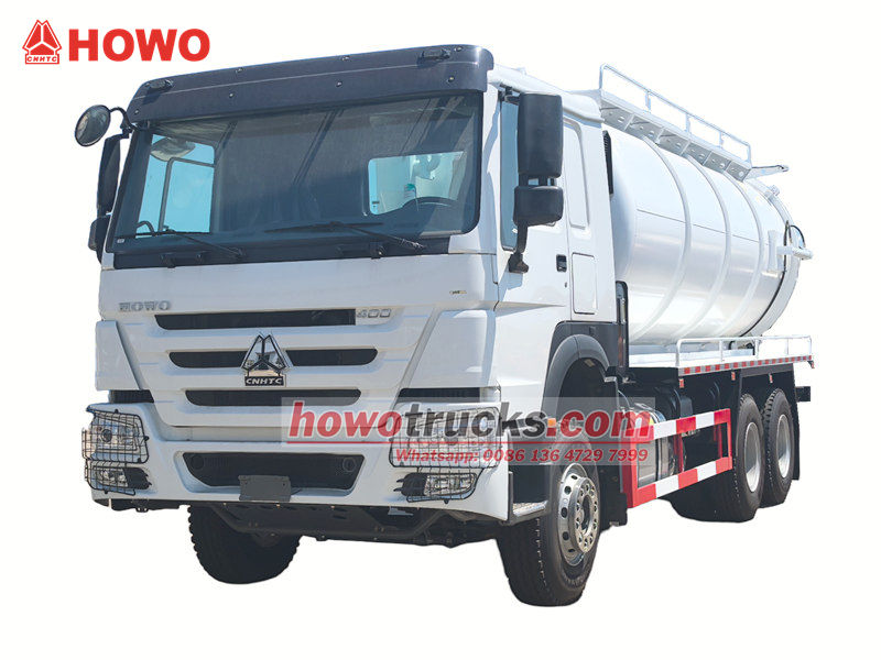 2x13000El camión bomba de succión al vacío Howo de 20 m³ es un vehículo especializado diseñado para la limpieza y el transporte de suciedad, lodos y aguas residuales. Se utiliza ampliamente en el saneamiento municipal, en empresas industriales y mineras, y en la gestión de propiedades residenciales.