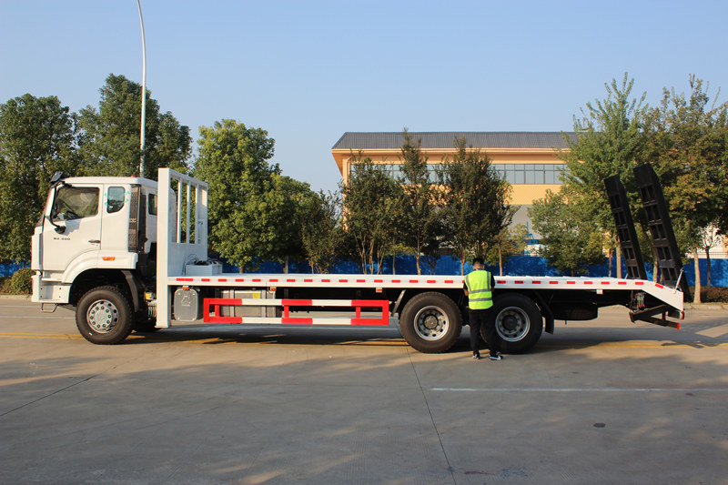 Un camión autocargador, también conocido como transportador de plataforma, camión autocargador o camión de transporte de excavadoras, es un camión especializado diseñado para transportar maquinaria de construcción pesada sin desmontar, como excavadoras y cargadoras. Sus características principales incluyen una plataforma plana de expansión hidráulica y equipos de autocarga como patas de apoyo hidráulicas, cabrestantes y rampas. Gracias a su chasis de alta capacidad de carga y a la estructura de plataforma reforzada y antideslizante, permite un transporte seguro y eficiente, así como la carga y descarga independiente de equipos de gran tamaño en obras de construcción, minas y centros logísticos, reduciendo la dependencia de maquinaria de elevación externa. Tomando como ejemplo el autocargador de plataforma plana SINOTRUK HOWO de 25 toneladas, este vehículo mejora las capacidades de transporte pesado profesional con un motor Weichai de 380 hp y ejes motrices de alta resistencia. Su plataforma plana se puede extender hidráulicamente hasta 3 metros de ancho y viene equipado con estabilizadores hidráulicos delanteros de 25 toneladas y un cabrestante de 8 toneladas, lo que proporciona una fiabilidad, capacidad de carga y eficiencia de autocarga excepcionales incluso en condiciones de trabajo difíciles.