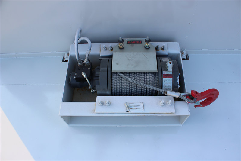 4. Carga y descarga automáticas eficientes: Incorpora un cabrestante hidráulico de 8 toneladas, una rampa hidráulica de 2 metros y una pata de apoyo hidráulica delantera de 25 toneladas, lo que permite la carga y descarga independiente de equipos sin necesidad de maquinaria adicional.