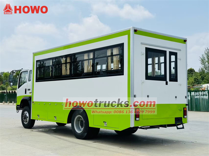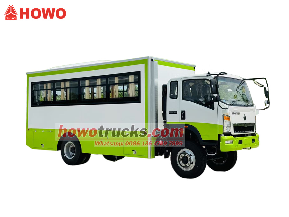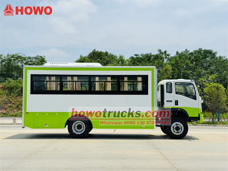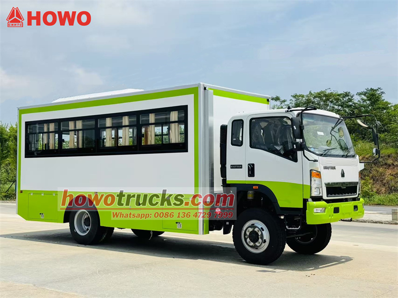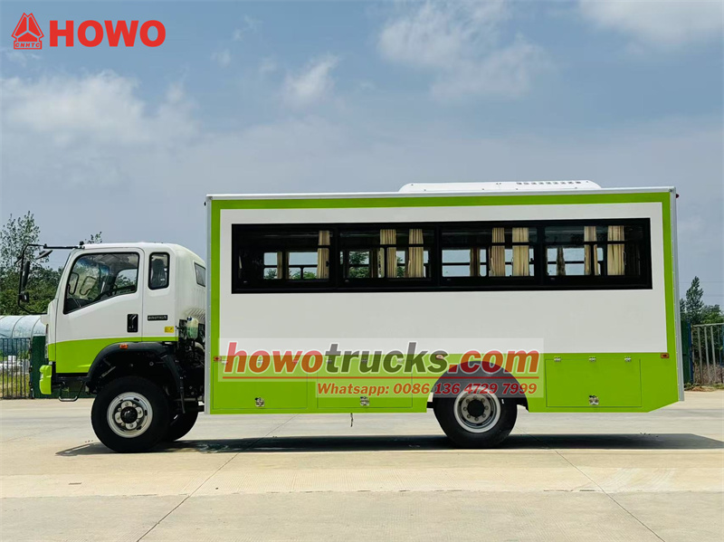 El camión de transporte de tropas HOWO 4x4 con tracción integral se basa en el chasis del camión ligero HOWO con tracción integral. Cuenta con una cabina semiabierta de 2080 filas, una distancia entre ejes de 3800 mm y está equipado con una transmisión Yuchai YC4E140-33 y una caja de cambios WLY6TS55. La parte superior es un compartimento de transporte de tropas con 22 asientos, ventanas transparentes y cortinas a ambos lados, y un portón trasero con ventana para facilitar la entrada y salida. Se han instalado portaequipajes sobre los asientos y a ambos lados del compartimento. El compartimento está equipado con aire acondicionado e iluminación, y se han instalado cajas de herramientas en la parte inferior.