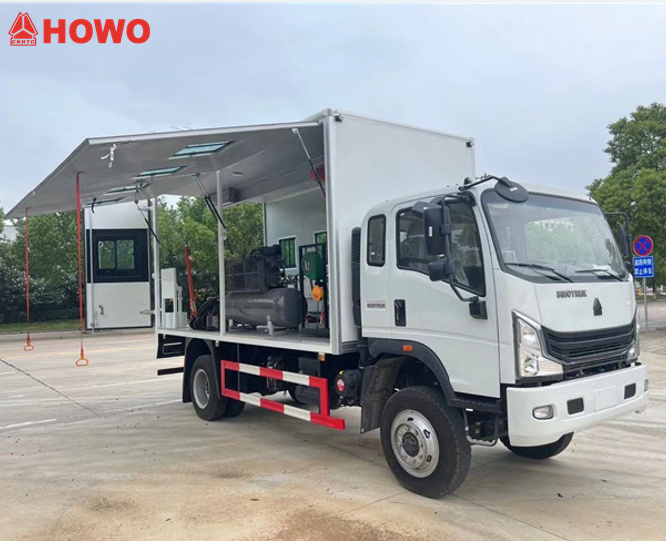 4200ElCamión de carga móvil HOWO 4x4 para servicio Es un vehículo de reparación integral diseñado específicamente para entornos de trabajo exteriores complejos. Su chasis con tracción en las cuatro ruedas proporciona una gran potencia. Su chasis superior tipo ala, de fácil manejo, está equipado con una grúa hidráulica, un generador diésel, un compresor de aire, una máquina de soldadura a gas y un dispensador de combustible, lo que permite realizar operaciones de mantenimiento a gran escala, incluyendo elevación de equipos, soldadura y suministro de energía. Puede llegar rápidamente al lugar de trabajo y comenzar las operaciones de inmediato.