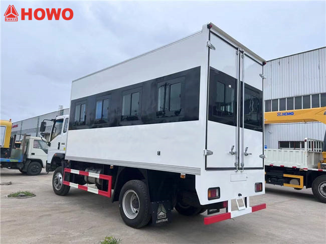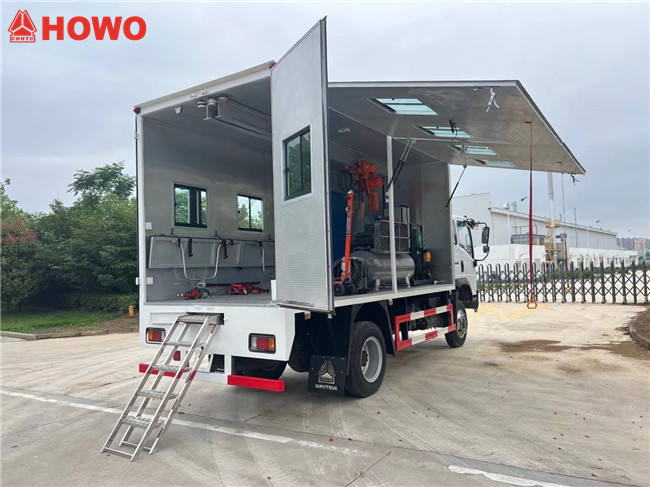 El vehículo móvil de mantenimiento HOWO 4x4 tiene las siguientes configuraciones: cabina de una sola fila HOWO 1880, distancia entre ejes de 3360 mm, motor Weichai WP3NQ140E50, caja de cambios WLY6G120, caja de carga de 4200*2100*2000 mm, panel lateral derecho con diseño de envergadura y soporte telescópico, ventanas, placa inferior de aleación de aluminio, iluminación interior y herramientas de mantenimiento que incluyen un compresor de aire, generador, estantes personalizados, una grúa de brazo plegable hidráulica, un armario de herramientas y un repostaje.máquina con boquilla de reabastecimiento de combustible y carrete de manguera de aceite de 10 metros, escalera, cilindros de oxígeno, cilindros de acetileno, máquinas de corte por gas y soldadura hidráulica, unaAmoladora de disco manual, dos extintores, etc.