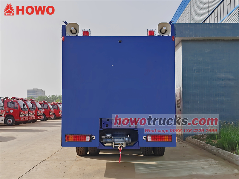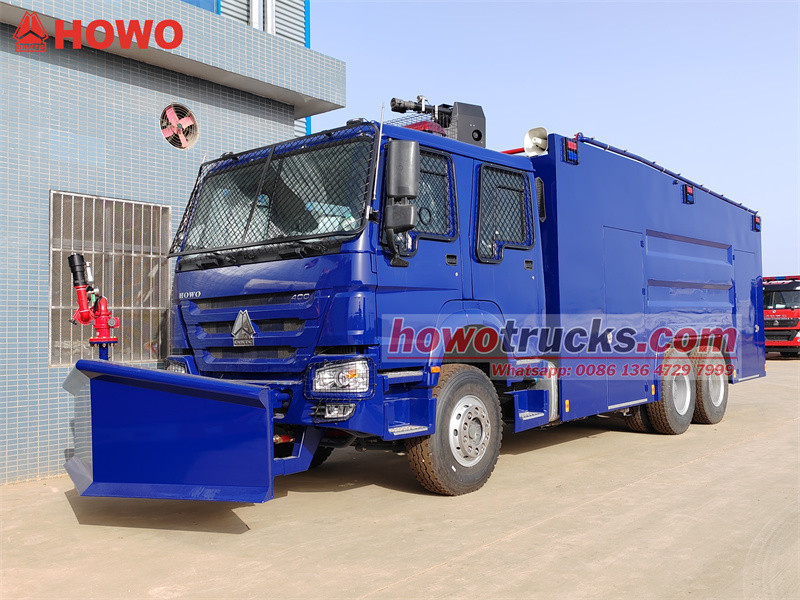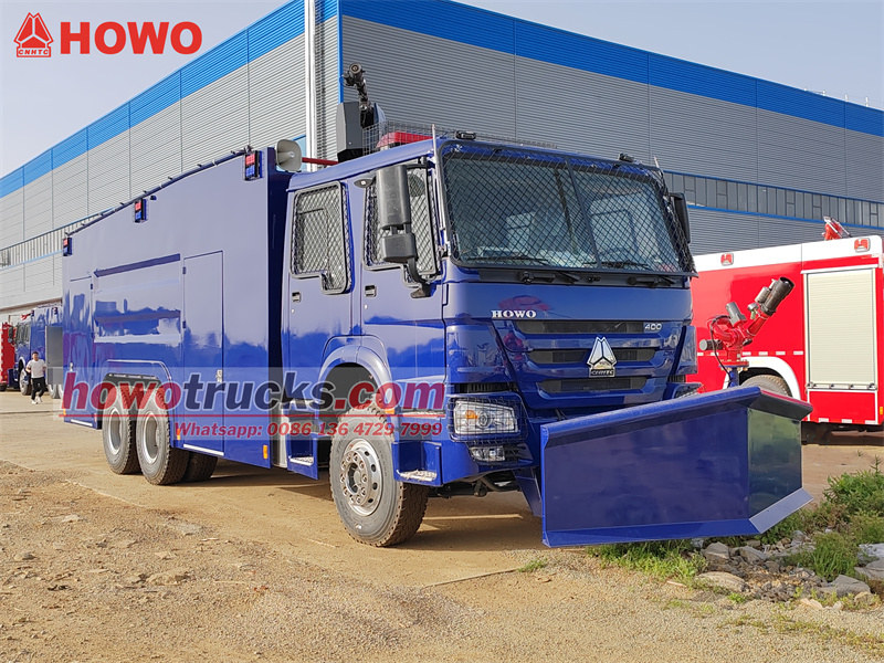 El camión cañón de agua a prueba de explosiones HOWO 6x4 está modificado sobre el chasis de cabina de doble fila HOWO HW76. Tiene una distancia entre ejes de 4600+1350 mm, está equipado con un motor WP12S400E201 y una caja de cambios HW19710. El vehículo cuenta con una carrocería de caja a prueba de explosiones, un cañón principal en la parte superior y un cañón auxiliar de agua fijo de disparo frontal, que permite el control de disturbios a larga distancia, con gran caudal y en todas las direcciones. Tiene una cabina de doble fila y una tripulación de 6 personas. Los tanques de agua, espuma, tinte y pimienta tienen una capacidad de 100 L, respectivamente. Está equipado con una bomba contra incendios CB10/60. La parte delantera del vehículo cuenta con placas de acero antidisturbios y una potente pala hidráulica de acero para la eliminación de obstáculos.