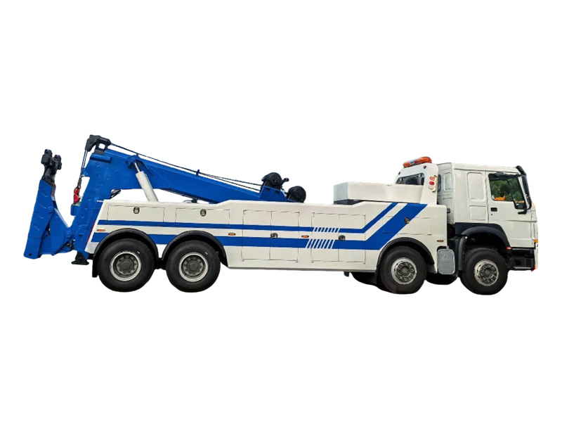 La grúa de servicio pesado HOWO 8×4 es un vehículo de rescate profesional con capacidad de remolque y elevación. Construida sobre el robusto chasis HOWO 8×4 y equipada con un motor Weichai de 400 caballos de fuerza, cuenta con una capacidad de elevación de 16 000 kg y dos cabrestantes de 80 kN. Esto permite realizar operaciones simultáneas de elevación, apoyo y remolque, lo que la hace altamente eficaz para el manejo de vehículos accidentados de gran tamaño en autopistas y vías urbanas, facilitando una rápida retirada de la vía.