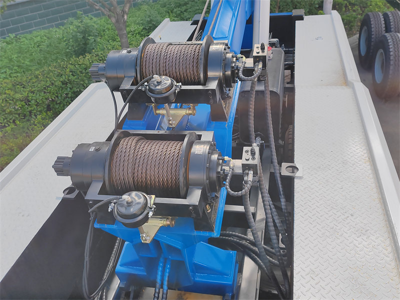 Equipada con dos cabrestantes hidráulicos de 10 toneladas y un cable de acero de 45 metros con un diámetro de 18 mm. El cabrestante es uno de los componentes principales de la grúa HOWO 8×4. Se utiliza principalmente para izar vehículos averiados al brazo de remolque y funciona en coordinación con cilindros hidráulicos para realizar funciones como el remolque, la elevación y la sujeción de las ruedas.