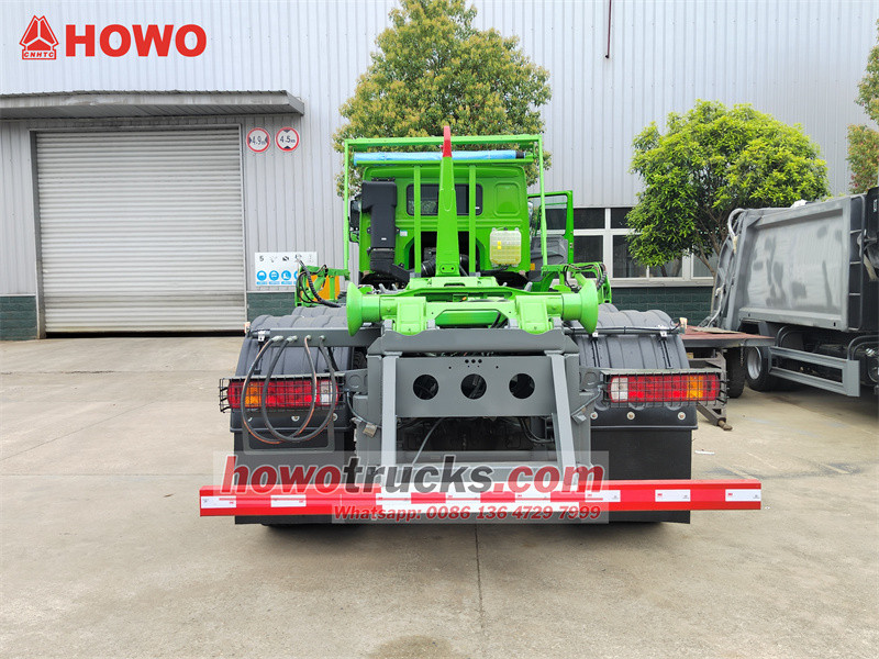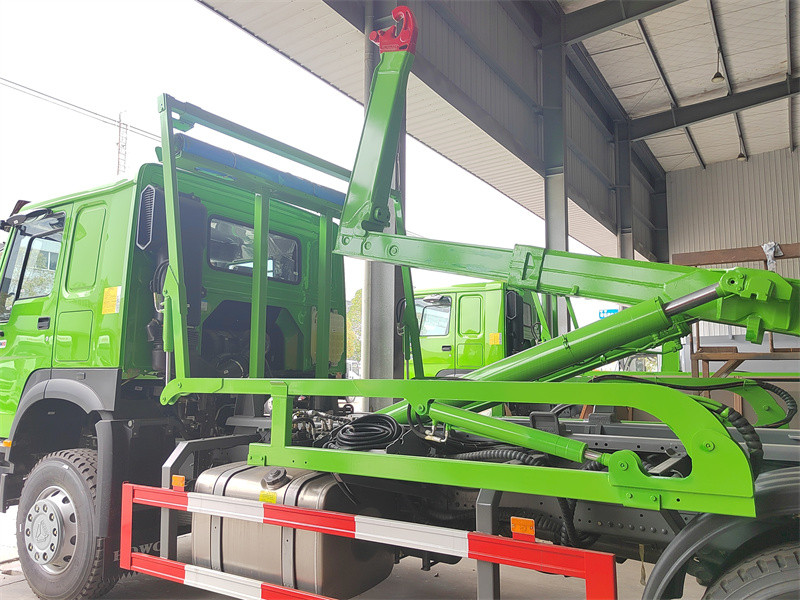Equipped PALFINGER hooklift unit,sheeting SystemEl Cargador de ganchos HOWO con sistema de lona Es un camión de basura de servicio pesado con sistema de gancho elevador, construido sobre un chasis HOWO 8x4, diseñado específicamente para la transferencia de residuos sólidos a gran escala. Su principal característica es la integración del sistema de gancho elevador Palfinger T26 y la innovadora tecnología de lona automática con rastrillo telescópico. El vehículo cuenta con una potente capacidad de elevación de 26 toneladas y puede accionar hidráulicamente la lona para sellar automáticamente el contenedor de basura durante todo el proceso, evitando eficazmente derrames y polvo durante el transporte. Un exclusivo sistema de bloqueo de seguridad garantiza que los sistemas de gancho elevador y lona no puedan operar simultáneamente, evitando así interferencias y daños en el equipo, y garantizando la seguridad operativa. Incorpora un sistema de lona original y de eficacia probada, compatible con todos los equipos de carga y descarga de gancho elevador del mercado. Logra una operación eficiente y respetuosa con el medio ambiente durante todo el proceso, desde la carga, descarga y transferencia hasta el sellado, convirtiéndolo en una potente herramienta de servicio pesado para el saneamiento urbano moderno.