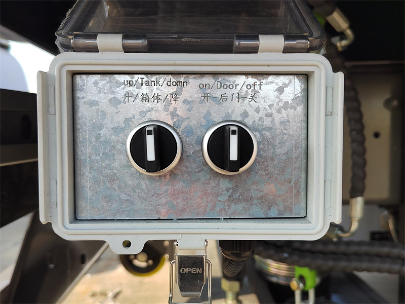 La puerta trasera del tanque está equipada con un mecanismo de cierre hidráulico tipo pasador. Este sistema permite la apertura, el cierre y el bloqueo automáticos de la puerta con solo pulsar un botón, lo que garantiza un sellado hermético y previene eficazmente las fugas de residuos y aguas residuales.