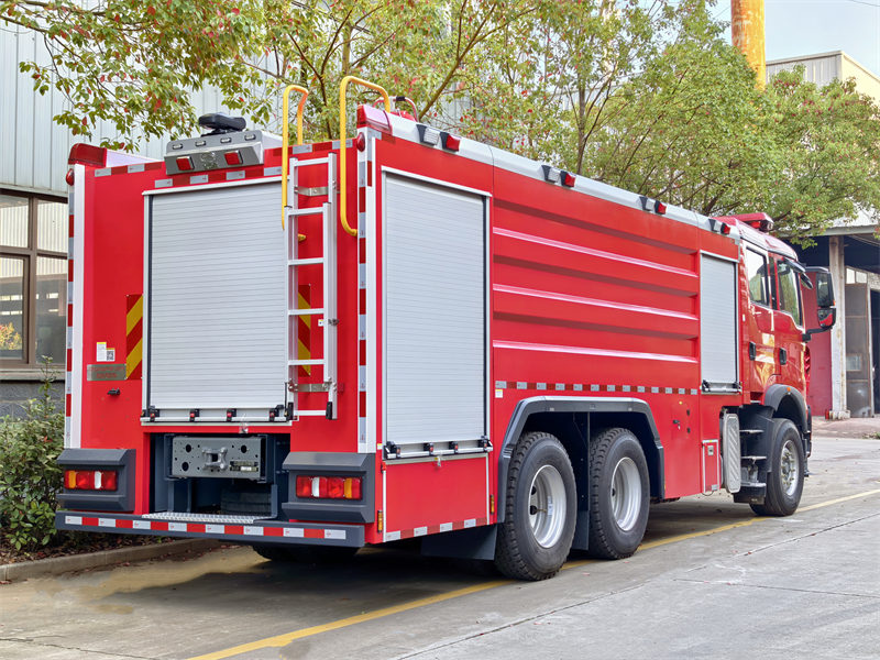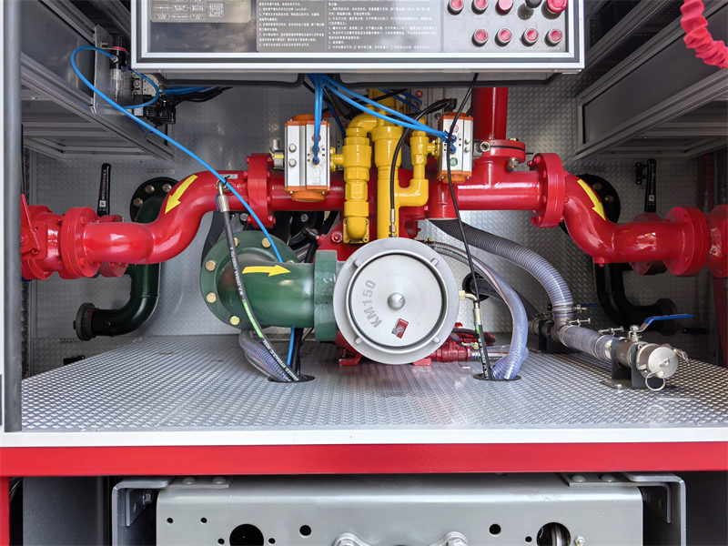Sistema de tanques: La parte frontal es la sala de equipos, donde se almacenan diversos equipos contra incendios (como mangueras, extintores, hachas, llaves inglesas, martillos, picos, etc.) para facilitar su acceso. En el centro, hay un tanque de agua de acero al carbono de 6 m³ y un tanque de espuma de 2 m³, ambos equipados con bocas de inspección en la parte superior.