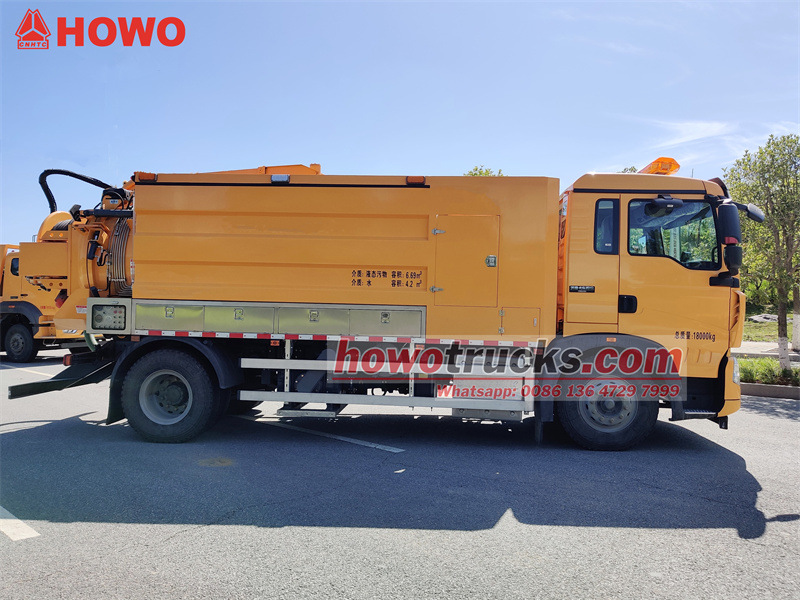 El camión dragador combinado HOWO 4x2 de 11 m³ es una modificación del chasis semicab HOWO TX 2280. Tiene una distancia entre ejes de 4500 mm y está equipado con un motor Sinotruk MC07.31-60 y una caja de cambios de 6 velocidades. Cuenta con un tanque de aguas residuales de 6,7 m³ y un tanque de agua limpia de 4,2 m³ fabricados en acero al carbono de 5 mm de espesor. Dispone de cajas de herramientas a ambos lados de la carrocería del tanque, y en uno de los lados se encuentra la caja de control, el carrete de la compuerta trasera, la válvula de descarga, la escalera, el tubo de inspección, etc. Está equipado con una bomba de vacío Jurop PVT400 y una bomba de limpieza de alta presión 3N2-SZ.