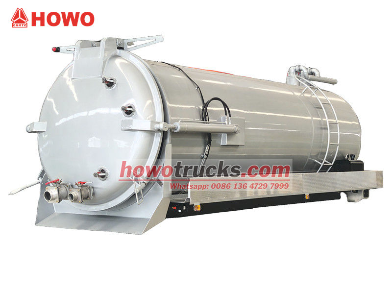 ●La parte superior del tanque séptico de 12 m³ consta de un cuerpo de tanque sellado, un sistema de extracción por vacío, controles y accesorios de seguridad.