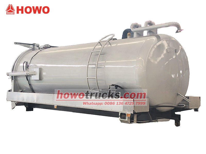 Optional MORO or Jurop pumpLa parte superior del tanque séptico nigeriano de 12 m³ consta de un tanque sellado, un sistema de extracción por vacío, controles y accesorios de seguridad. El cuerpo del tanque está fabricado en acero al carbono de alta resistencia y tiene forma cilíndrica. Su interior cuenta con un tratamiento anticorrosión que garantiza un sellado resistente a la presión y evita fugas.