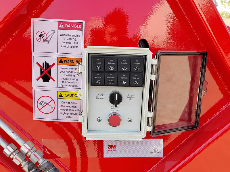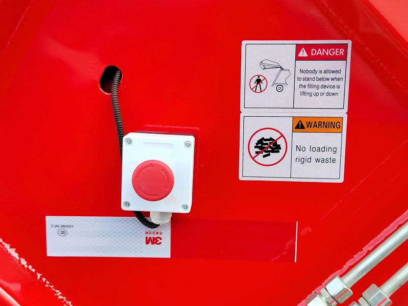 ►Un botón de freno de emergencia especialmente diseñado permite detener el mecanismo de compactación de residuos en cualquier estado o posición, garantizando así la seguridad del personal y del equipo.