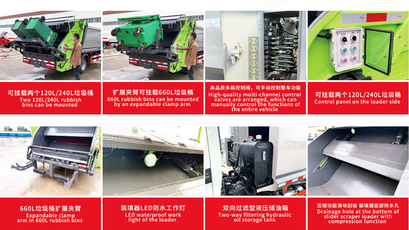 ●Fácil manejo: El dispositivo de carga automático situado en la parte trasera permite realizar rápidamente el levantamiento, la trituración y la compactación de los residuos, ahorrando tiempo y mano de obra.
